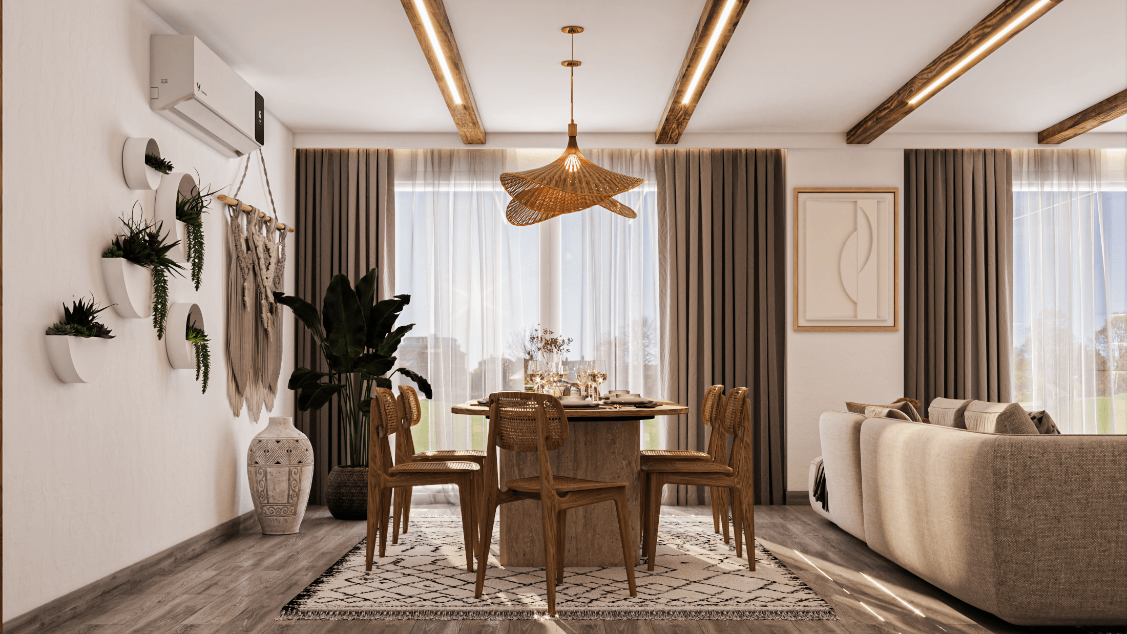 Takween Design House presents a stunning embodiment of bohemian chic in this La Vista apartment. We've meticulously curated a space that exudes warmth, creativity, and a sense of effortless elegance.