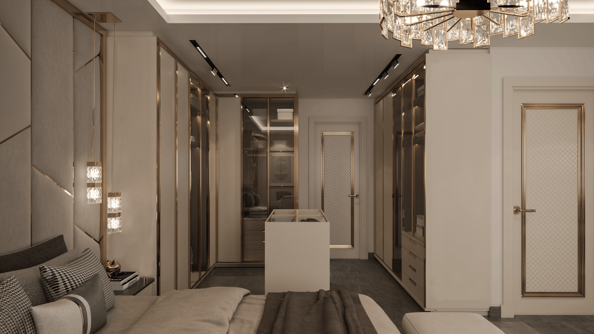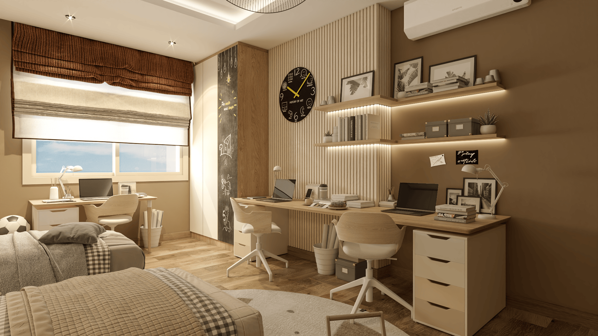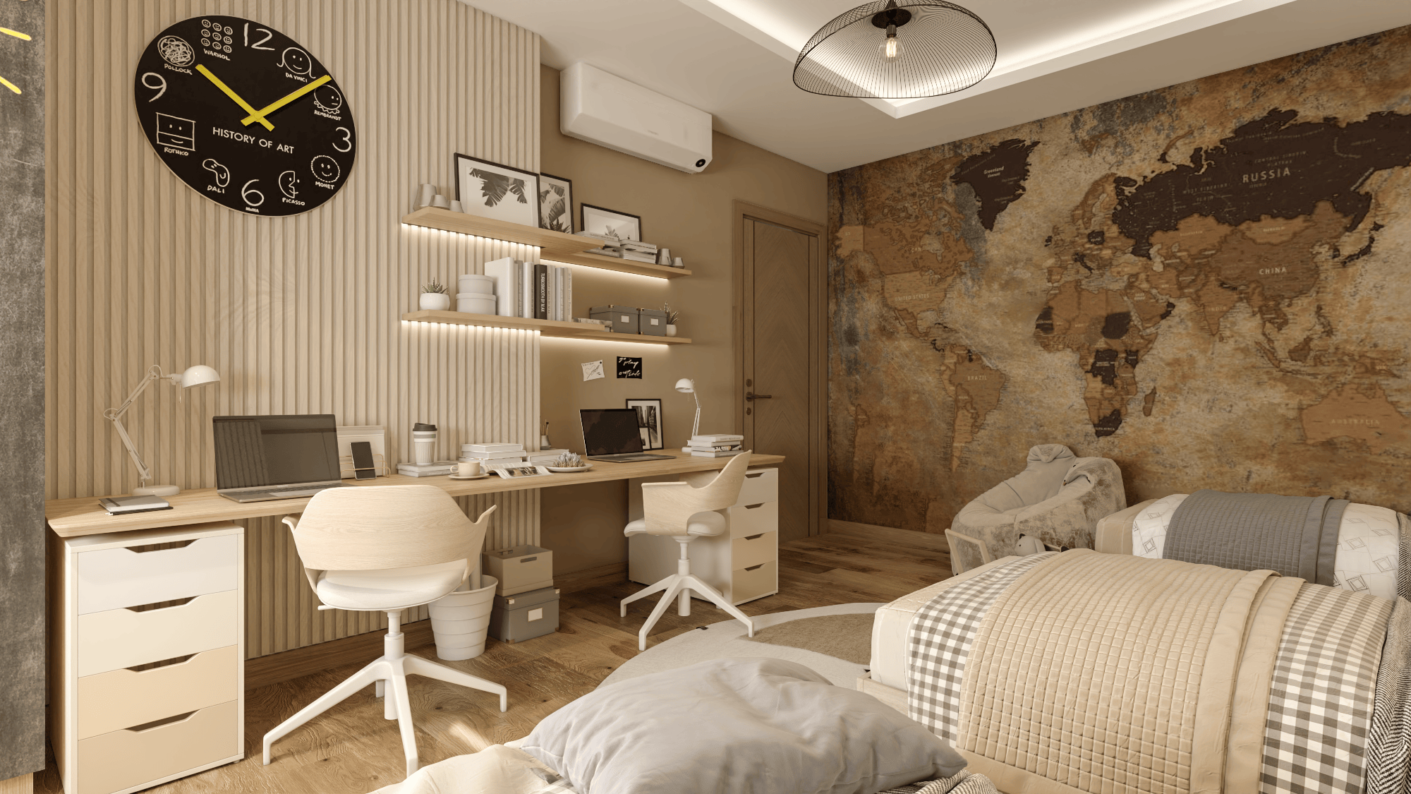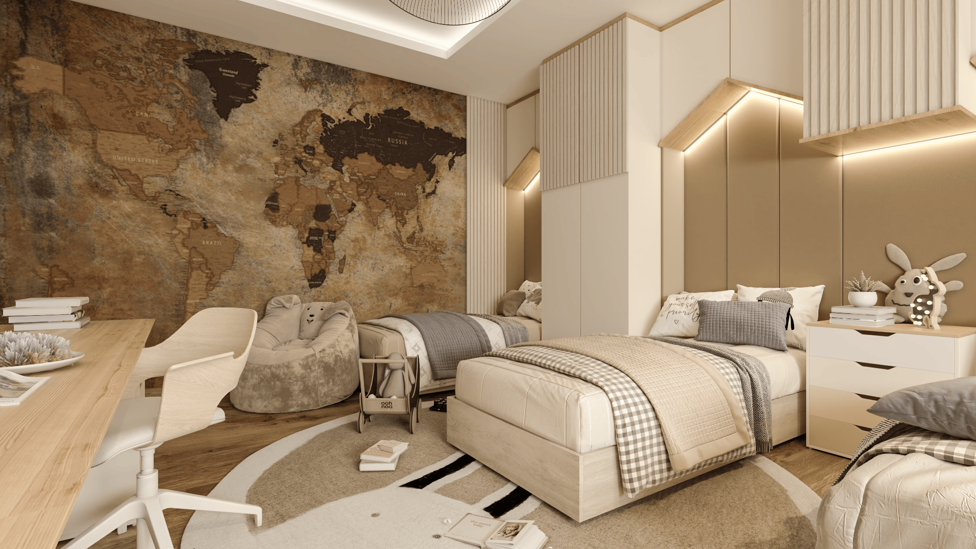 The apartment's living areas are adorned with statement wallpapers and accentuated by a bold color palette, adding a touch of vibrancy to the space. Each room seamlessly transitions into the next, with a focus on open-plan living to foster family connection and interaction.