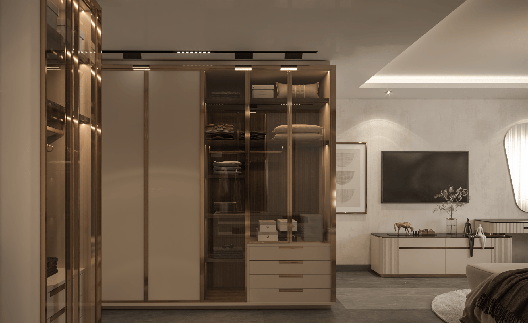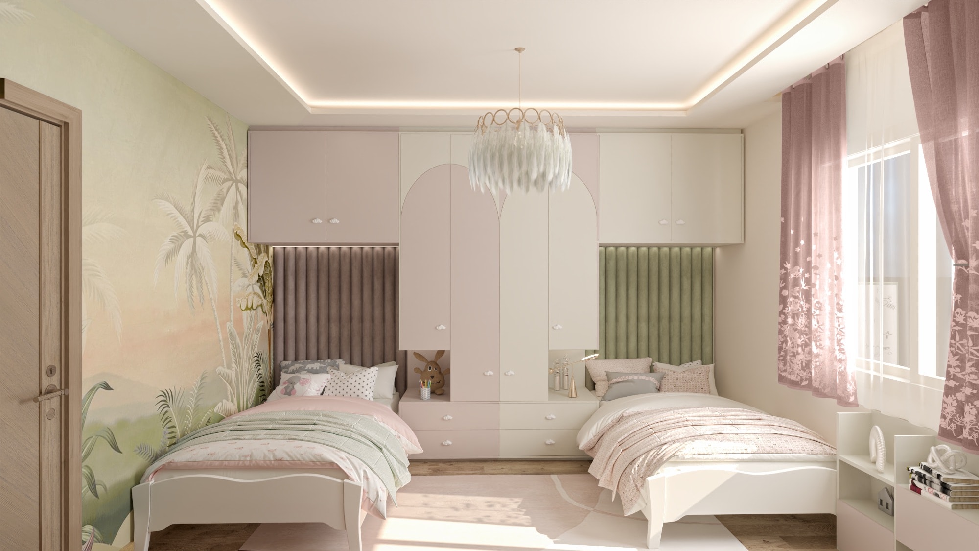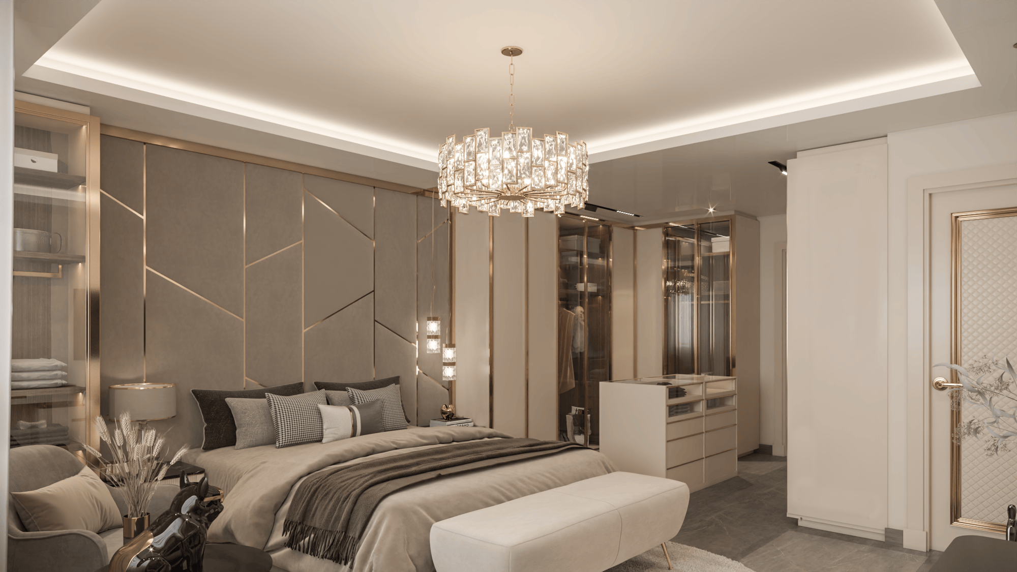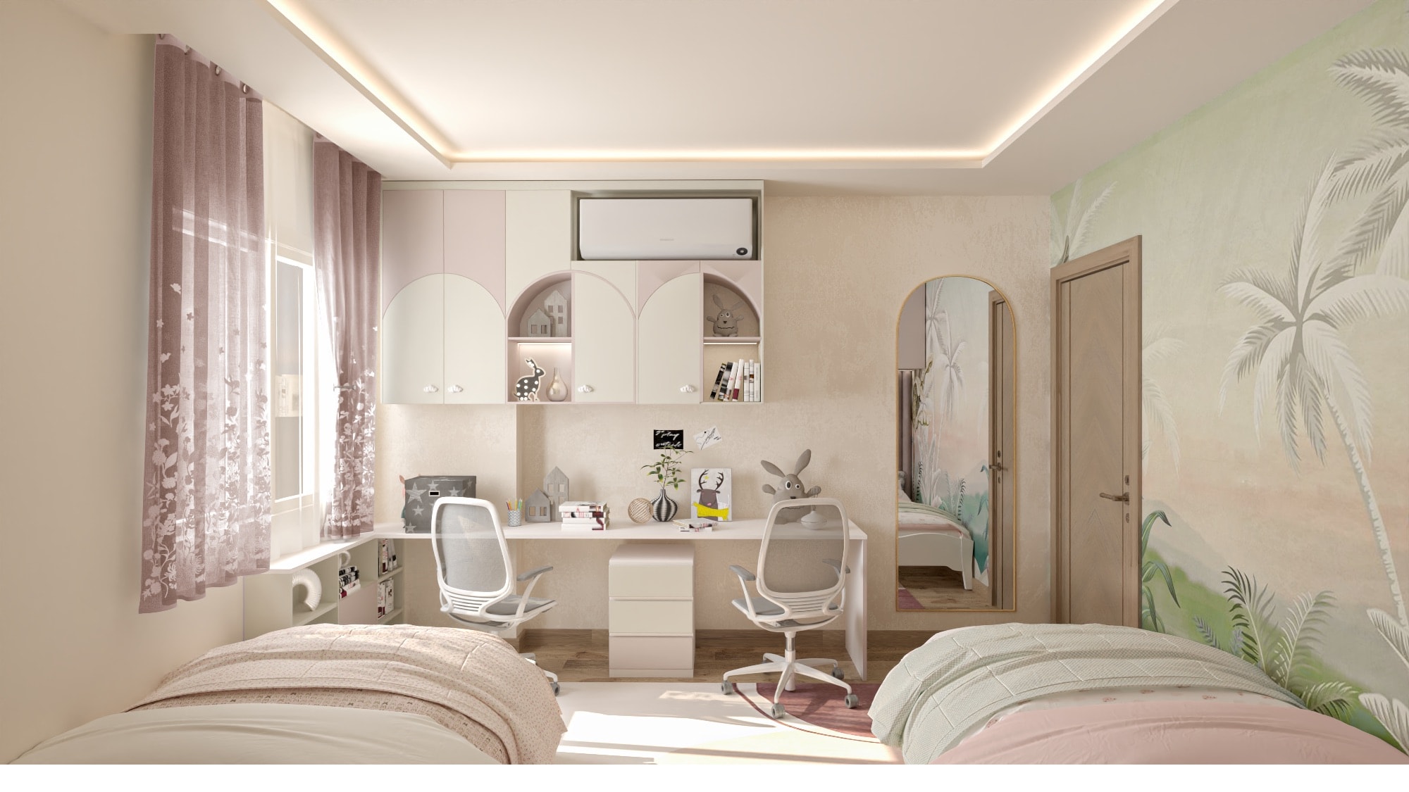 The apartment's living areas are adorned with statement wallpapers and accentuated by a bold color palette, adding a touch of vibrancy to the space. Each room seamlessly transitions into the next, with a focus on open-plan living to foster family connection and interaction.