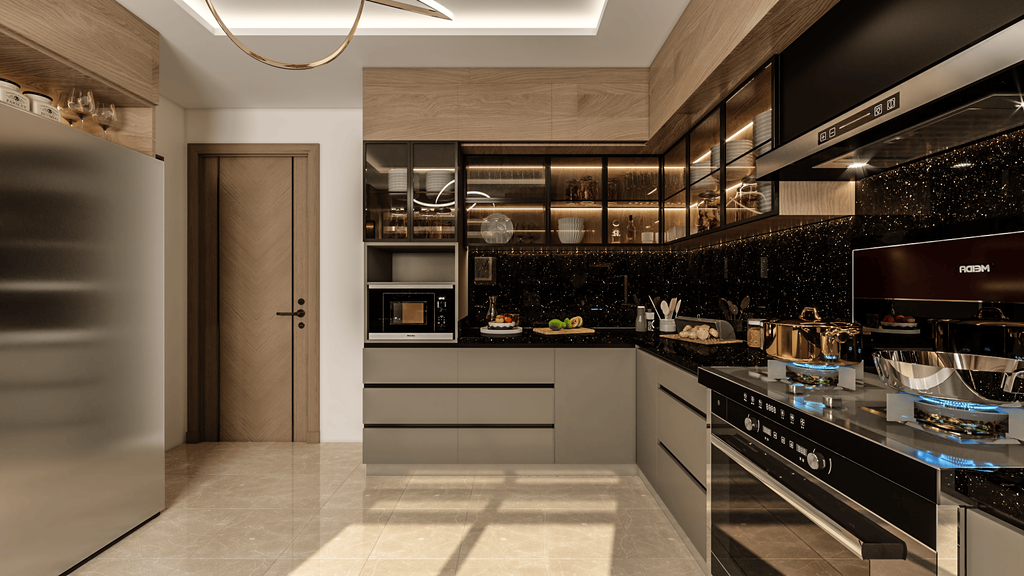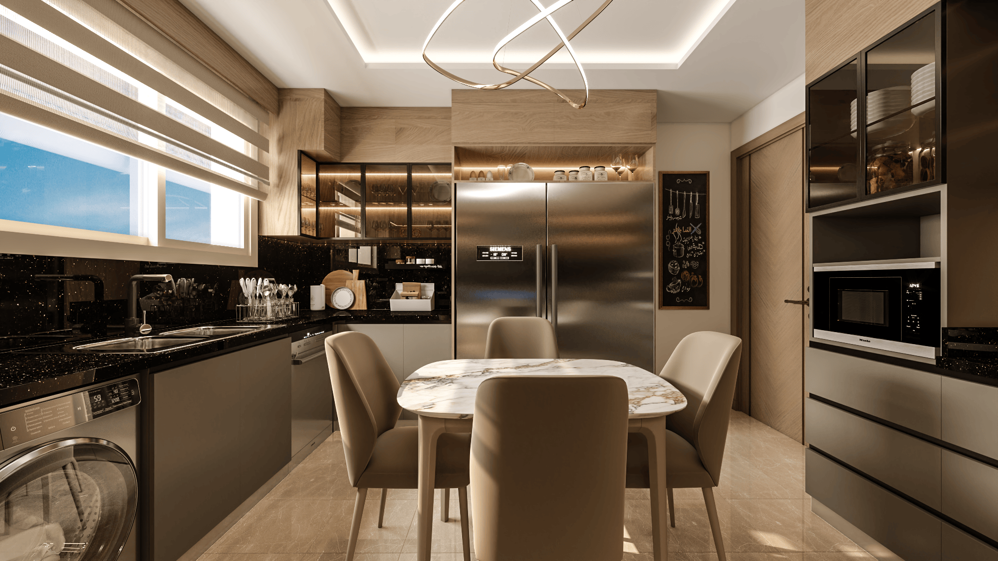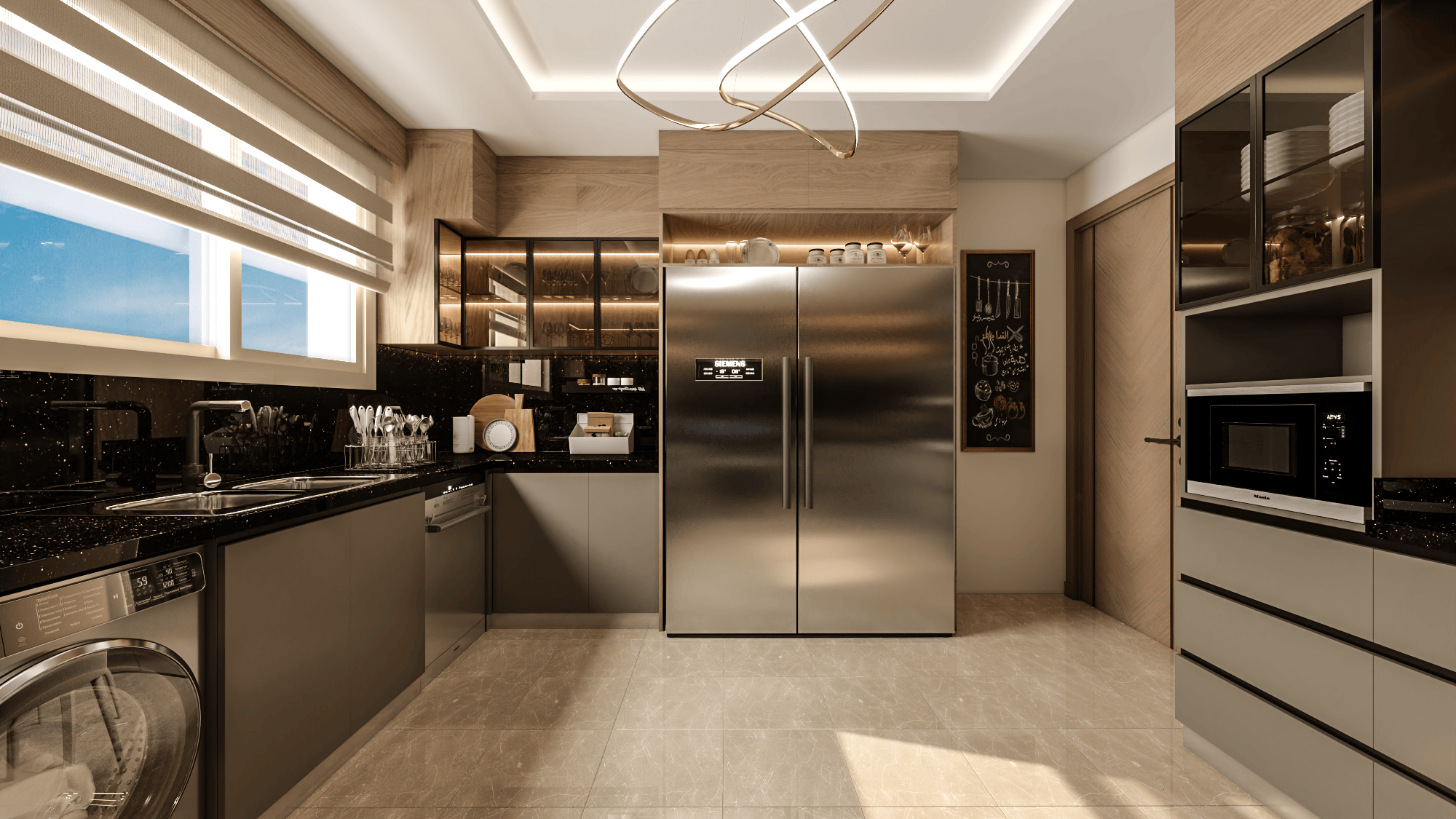 The modern, state-of-the-art kitchen serves as the heart of the home, boasting high-quality appliances, sleek cabinetry, and ample storage space. This culinary haven is both aesthetically pleasing and highly functional, catering to the unique needs of a large family.